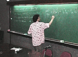 Por volta das 17h, o Prof. Helayël começou a sua comunicação. Ele colocou a ênfase na conexão entre o seu trabalho iniciado em Trieste, sob os auspícios do Prof. Abdus Salam, e as diversas linhas de pesquisa desenvolvidas atualmente dentro do seu grupo. Com a desenvoltura e excepcional capacidade didática que todos conhecem, expôs durante aproximadamente 40 minutos o papel da Supersimetria nas teorias grande unificadas, ressaltando a necessidade da sua quebra em baixas energias e a tecnologia necessária para tratar este problema (em cujo desenvolvimento ele teve papel essencial, sendo referência internacional no assunto). Ao final de seu seminário, o Prof. Helayël fez uma emocionante profissão de fé no ser humano e uma conclamação ao trabalho solidário, tanto entre indivíduos quanto entre instituições. Enfim, propôs uma Física feita com base no Amor e na Solidariedade. Suas palavras ecoaram fortemente na platéia (cerca de 80 pessoas de todos os departamentos do CBPF e de várias instituições do Rio de Janeiro e de fora de nosso estado), que o aplaudiu de pé e demoradamente ao final.